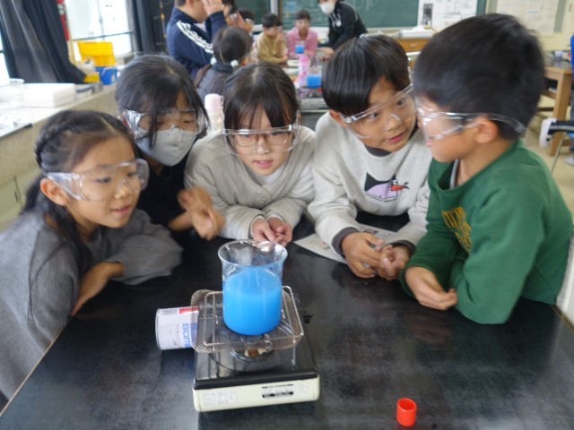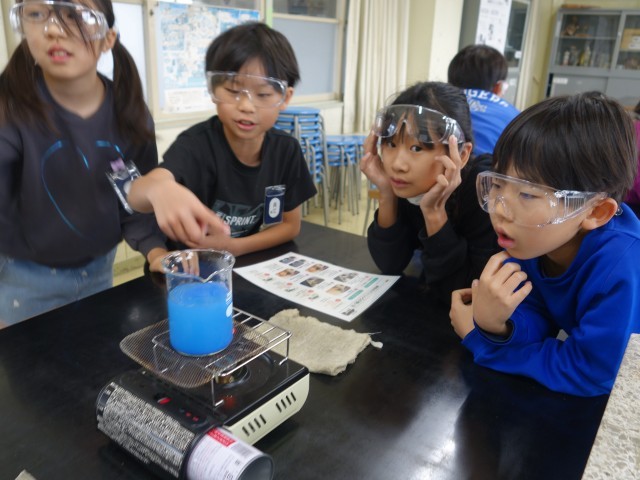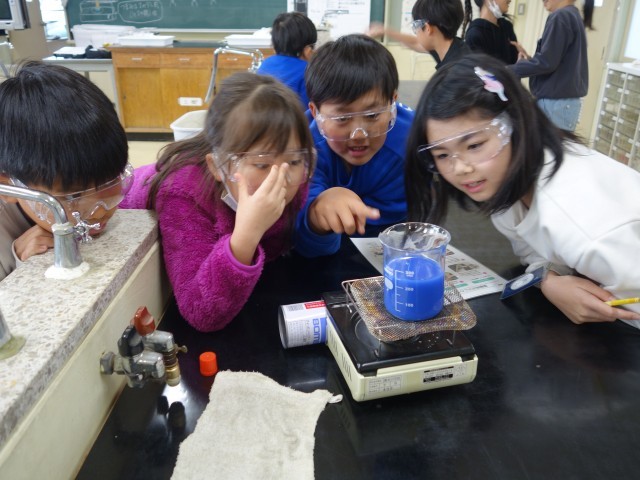 4年1組は理科の実験を行いました。ビーカーに入った色水をコンロで熱して、水の動きを観察しました。ぐるぐると動く様子を観察することができて、みんな真剣なまなざしで眺めていました。