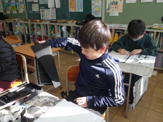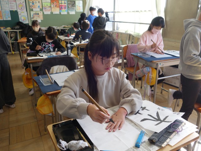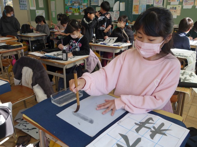 今日の書の時間、4年1組では「木材」という文字を書きました。一画一画の「とめ・はね・はらい」を意識しながら、一筆ずつ丁寧に筆を運んでいました。漢字のバランスをとるのが難しい課題ですが、お手本をじっくりと見つめ、集中して取り組んでいました。