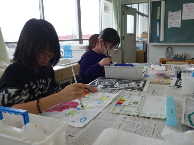 5年2組の図画工作では、「多色刷り版画」の制作に取り組んでいました。今回、みんなが取り組んでいるのは、ただ刷るだけではなく、一工夫加えた技法です。刷り上がった黒い線の裏側から色をのせることで、和紙を通して色が柔らかく浮かび上がります。色の混ざり合いを楽しみながら、丁寧に自分のイメージを形にしていました。