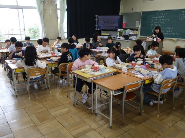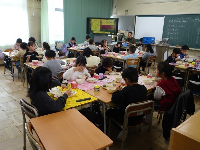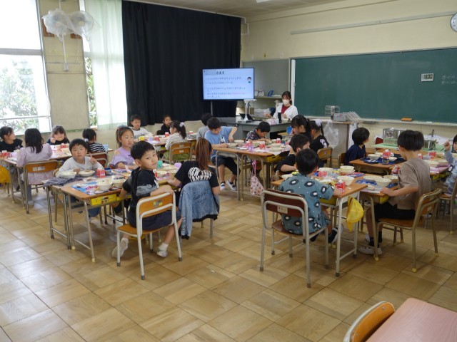 昨日から、いよいよ今年度の給食が始まりました。 進級した2年生から6年生の教室をのぞくと、配膳をテキパキとこなし、みんなで美味しそうに食べる姿が見られました。「みんなで食べるともっとおいしいね」と、どのクラスも和やかな雰囲気に包まれていました。栄養たっぷりの給食を力に変えて、心も体も大きく成長してほしいと願っています。1年生の給食開始も楽しみですね。