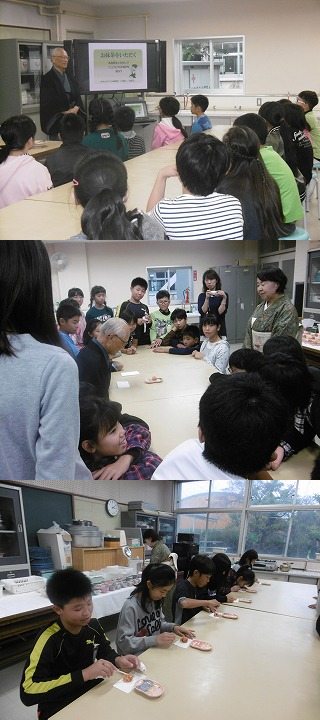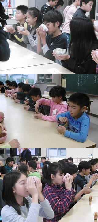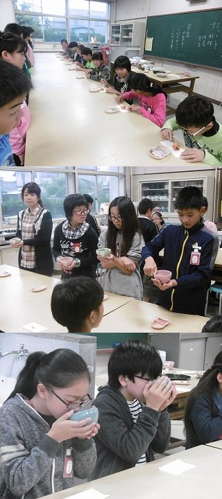 6年生の総合的な学習の時間で茶道体験をしました。6年生のテーマは国際理解です。国際社会の中の日本について、より深く理解するための今日の学習です。裏千家流の茶道の先生2名の方が来校され、茶道の歴史やその奥深さについてお話しされ、後半は実際に茶筅を使ってお抹茶をたて、友達同士でお手前を披露しました。