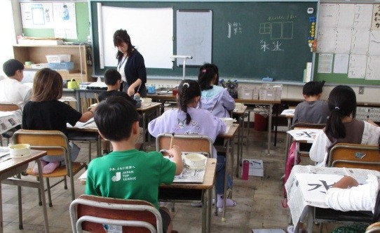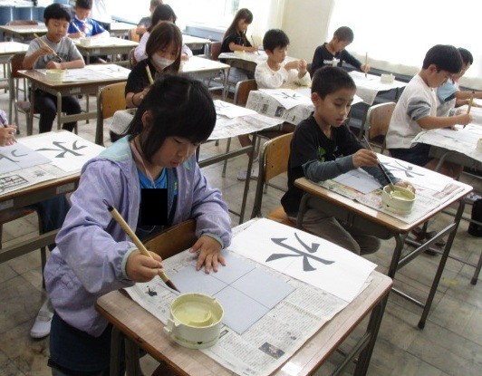本日、書の先生が水習字の授業をして下さいました。「水」の文字の中心に気をつけて、子どもたちは正しく書くことを意識して丁寧に書いていました。また、縦画や始筆・終筆の位置に気をつけながら字形を整えて書くことができました。今後は、墨汁を使う習字が始まります。筆の使い方や、字形を整える書き方を知り、美しい文字を書くことができるようになってほしいと思います。