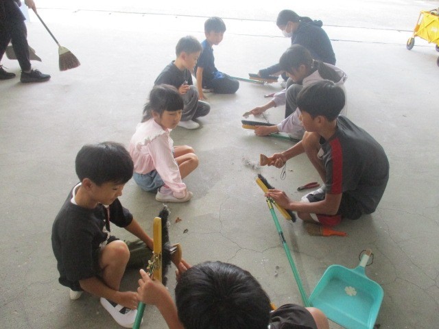 今週、美化委員のみなさんが、学校のほうきを直してくれています。