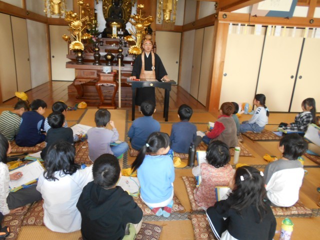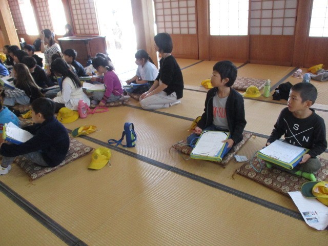 本日、生活科の町探検として、麟慶寺へ行きました。まず、座禅体験を行うため、座禅の仕方を聞き、取り組みました。慣れない座禅でも、静かに心を整えて一生懸命に取り組もうとする姿が見られました。その後、命の話として、代々、多くの先祖から受け継がれて、自分の命があることを教えてもらいました。自分自身の命の大切さを実感する様子が見られたり、ワークシートに書く児童もいたりしました。今後も、地域の施設を見たり、様々な仕事の話を聞いたりして、視点を広げた経験をして学びにつなげてほしいと思います。