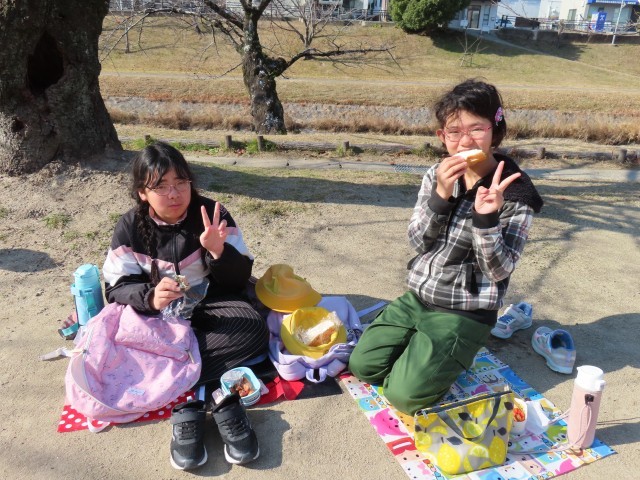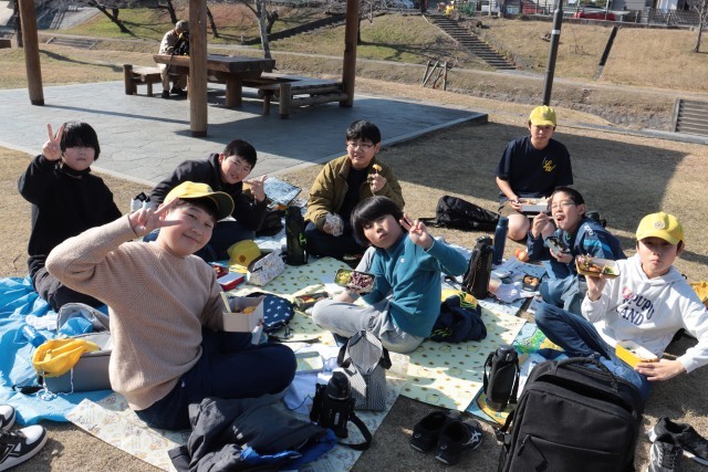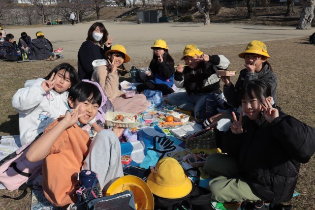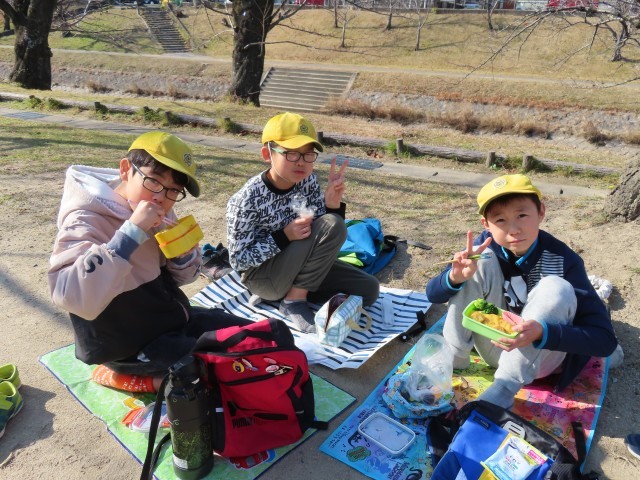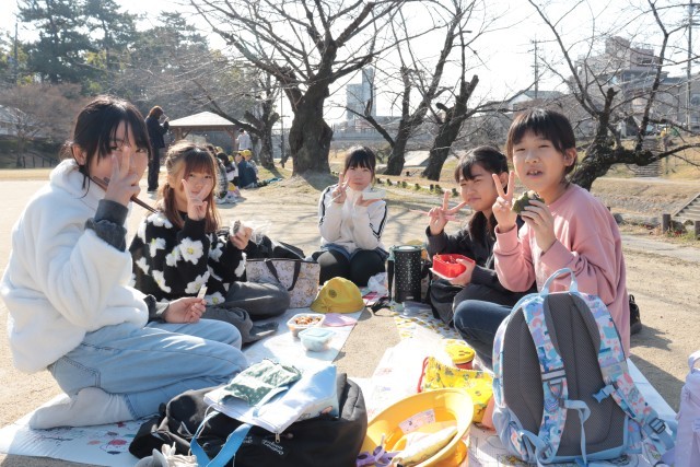 お昼は岡崎城公園に移動し、風のない穏やかな陽気の中で、お待ちかねのお弁当タイム。お互いのお弁当を見せ合いながら楽しくいただきました。公園内では、徳川家康公(武将隊)に出会うという嬉しいサプライズもあり、一緒に写真を撮っていただくことができました。