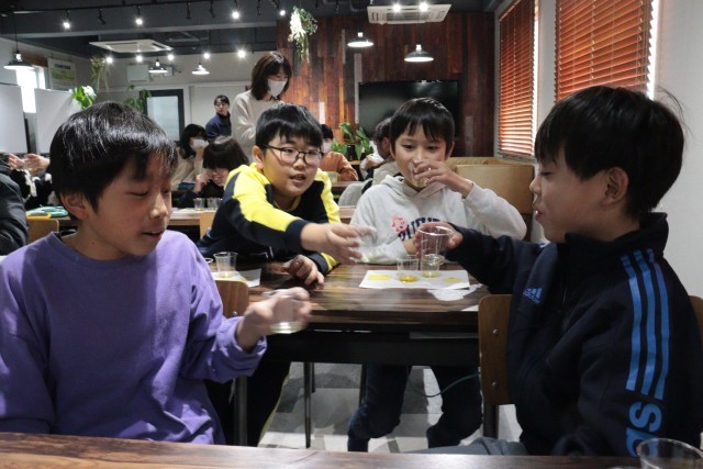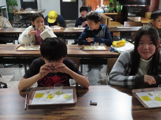 午後は「太田油脂株式会社」へ向かいました。工場見学では、安心・安全な油を届けるための徹底した工夫を間近で学習しました。セミナーでは、植物油の種類が70種類ほどもあることに驚きの声が上がりました。3種類の油を当てる「オイルテイスティング」では、五感を研ぎ澄ませて匂いや味を比べ、見事正解する子が続出しました。
