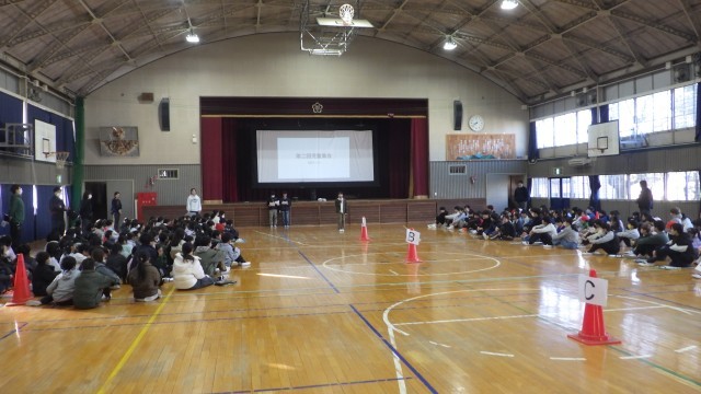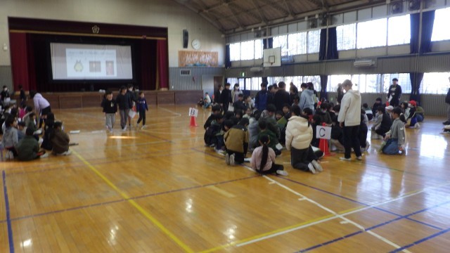 今日は、朝の業前の時間に児童集会を行いました。縦割り班ごとに分かれ、クイズに答えました。異年齢の子同士で答えを相談して、皆楽しそうに取り組んでいました。