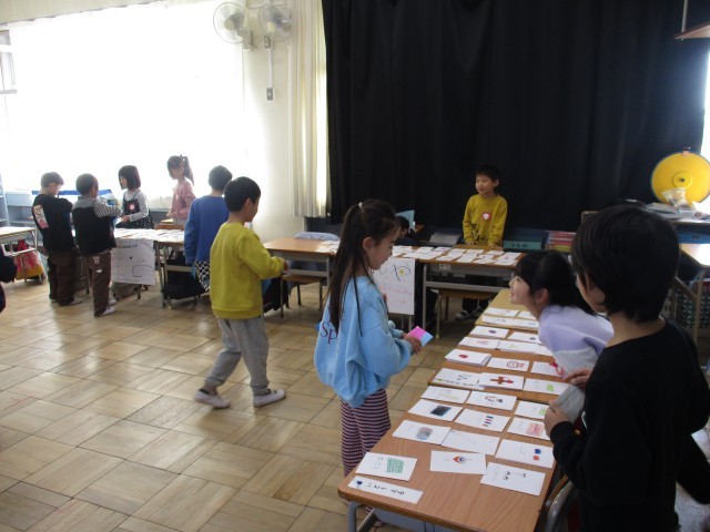 2月12日(木)に行った国語ものの名まえの活動の一つの、おみせやさんごっこの様子です。7つのグループが、おもちゃ屋、魚屋、パン屋などになり、カードに品物を絵に描いて店をひらきました。お客と店屋が交換しながら、活動しました。この日のために看板なども準備しました。おはじきをお金にしての店ごっこはとてももりあがりました。とても楽しかったです。