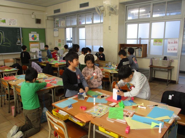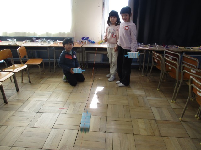 図工「するするビューン」の制作をしました。教室に斜めに張ったひもに、箱をロープウェイのようにすべらせる仕組みの工作です。滑る動きが楽しいので、箱にやわらかい紙を付けたり、翼を付けたり、すべらせては改良しながら制作をしました。楽しく活動ができました。来週も引き続き、するするビューンを制作します。
