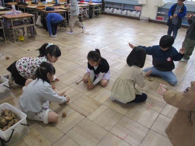 生活科でむかしあそびをしました。こまや、お手玉、わなげ、けん玉など、自由に遊べるようにしました。こまが長く回ったり、けん玉がうまくできるようになったりしました。わなげやおはじきで、友達と勝負するのも盛り上がっていました。最後に、たのしかったことを絵と文でまとめました。