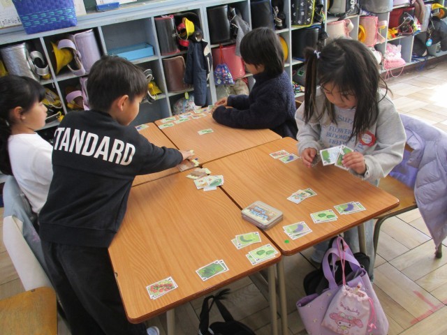 みんなでカードゲームを楽しみました。このゲームは、野菜の収穫をテーマにしていて、担任の先生の手作りです。ルールもすぐに覚えて、楽しく遊びました。とても盛り上がりました。