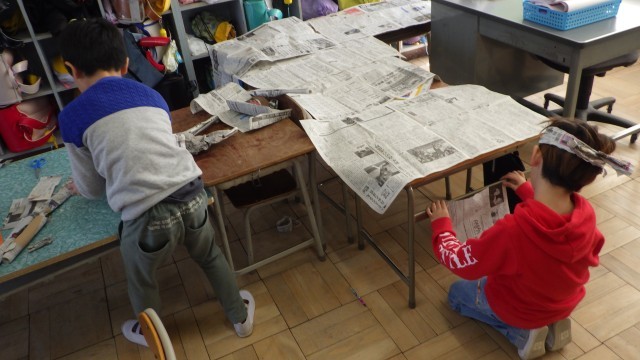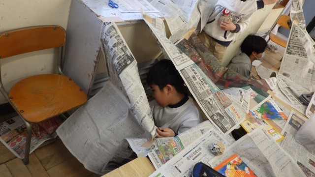 図工の「しんぶんしとなかよし」で、新聞紙を使って自由に、衣装や帽子をつくったり、トンネルや秘密基地をつくったりしました。新聞紙を折ったり、丸めたり、ちぎったり、繋げたりしながら、思い思いに発想し、楽しく活動していました。