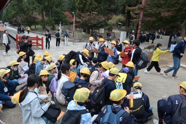 奈良公園の班別学習を開始しました。無事にミッションをクリアできることを祈っています。
