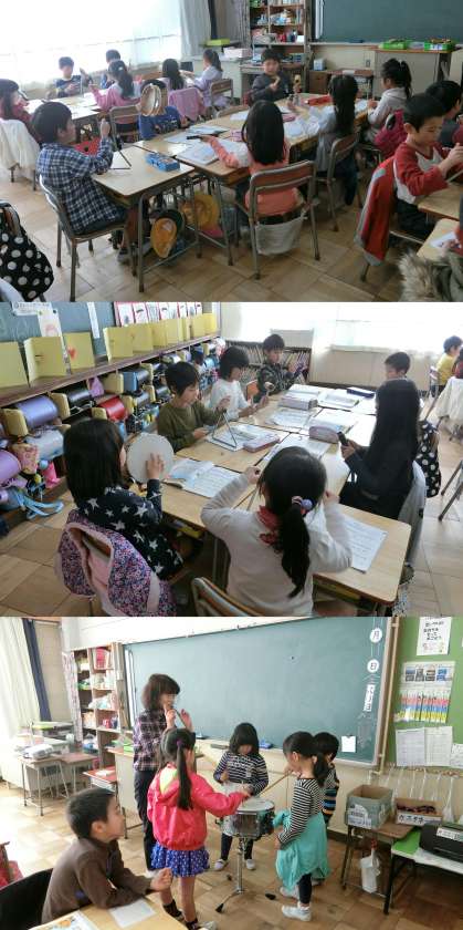 11月11日(金)、2年生の音楽授業のようすです。『いろいろな音をたのしもう』の単元で、「かぼちゃ」の歌を歌いながら、分担した打楽器のリズム打ちに取り組んでいました。