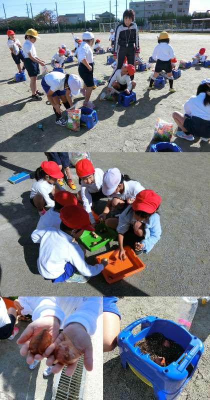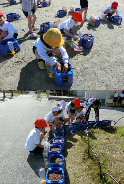 11月16日(水)、1年生がチューリップの球根を植木鉢に植えました。1学期にアサガオを育てた植木鉢に、手際よくチューリップの球根を植えていました。来年の4月にどんな色の花が咲くか楽しみです。