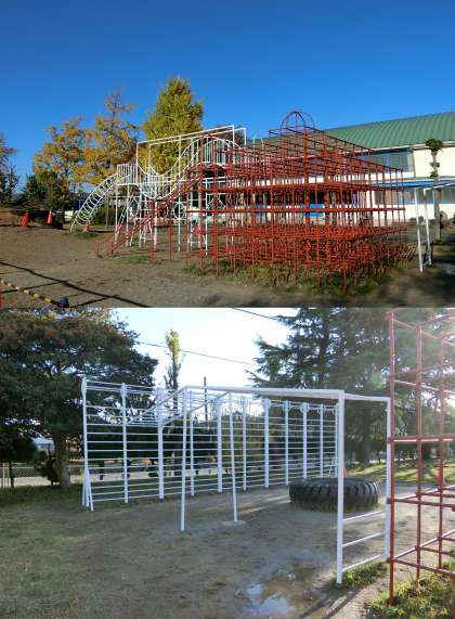体育館前のコンビネーション遊具とうんていのペンキを塗り直しています。さび止めを塗った上に、下地の白色を塗っています。子どももたちは、「青色と赤色になるよ。」「黄色もあったよ。」「今度はにじ色がいいね。」と、仕上がりの色を楽しみにしています。