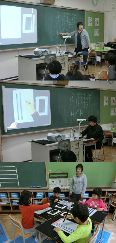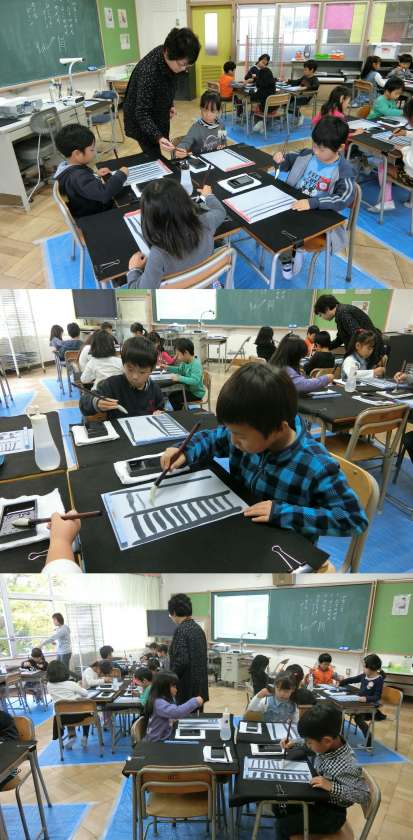 11月21日(月)、1年生の書道科授業のようすです。2回目の今日は、「たての線」「よこの線」「せんろ」「ひこうきブーン(下から斜め上に向かう線)」「ボールポーン(たて線から斜め上の線)」を、書道の先生の手本を見ながら筆で書いていました。