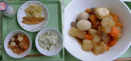 11月22日(火)、今日の給食献立は、「わかめごはん・牛乳・『ぐる煮』・からふとししゃもフライ・キャベツのアーモンドあえ・卓上ソース」でした。
