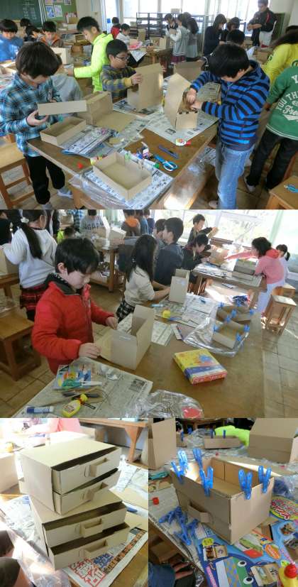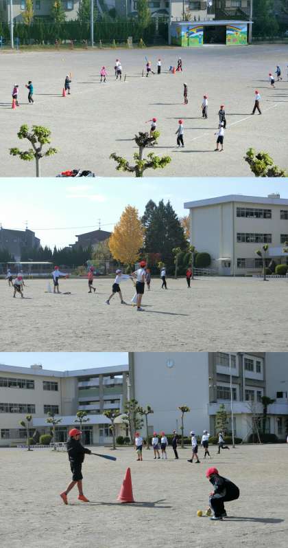 11月25日(金)、4年生の図画工作、5年生の体育授業のようすです。4年生は、『おもしろアイデアボックス』の単元で、3種類の中から気に入った形の箱を作っていました。5年生は、Tボールのバッティング練習をしていました。