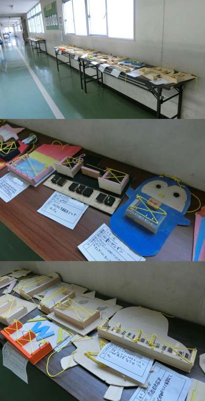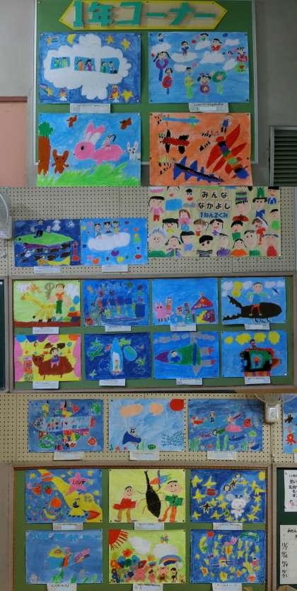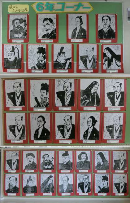 1・4・6年生の掲示板のようすです。1年生は、自分が乗りたい生き物に乗って行ってみたいところを、『のってみたいな いきたいな』で表しました。4年生は、『ギコギコクリエーター』の単元で、のこぎりを使って壁掛けを作りました。6年生は、木版画で歴史上の人物を制作しました。