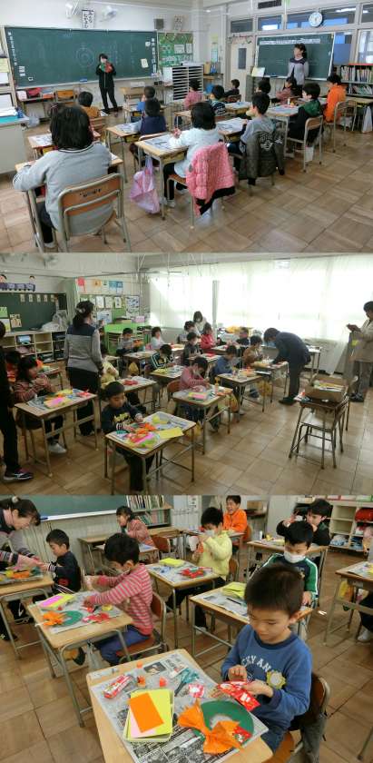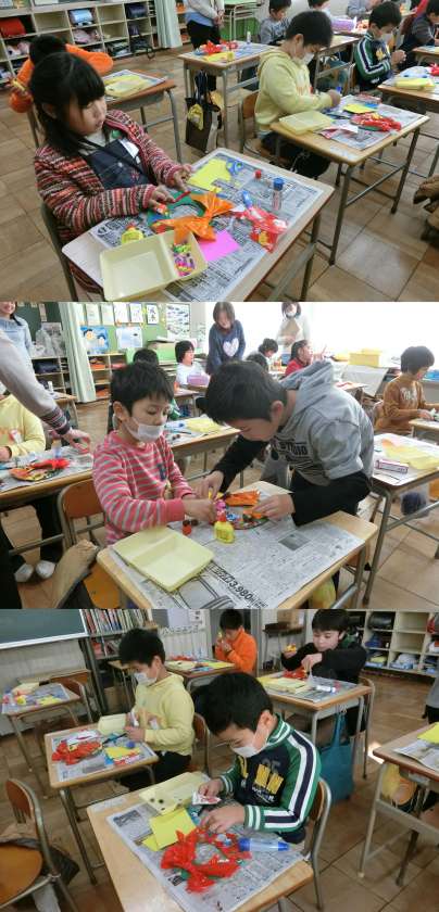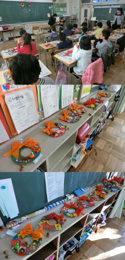 11月28日 研究授業 かえで・もみじ・いちょう、図画工作 公開日 2016/11/28 更新日 2016/11/28 5組・6組・7組・8組 11月28日(月)、かえで・もみじ・いちょう学級が図画工作の研究授業を行いました。ビニールや色紙、どんぐりを使って、クリスマスリース作りに取り組みました。
