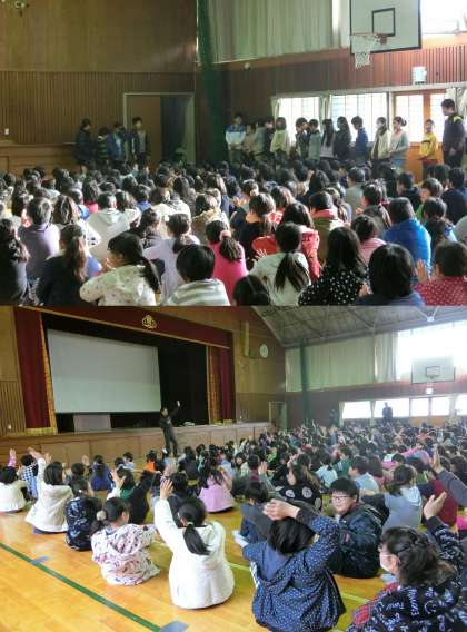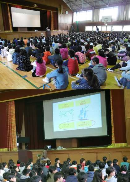11月28日(月)、朝会を行いました。校長先生の話の後、給食委員会から給食を食べることの大切さと「からっぽ賞」の取り組みについて発表がありました。そして、なわとび集会を行ってから、生徒指導の先生から「地域の人たちにすすんであいさつをしよう」と話がありました。