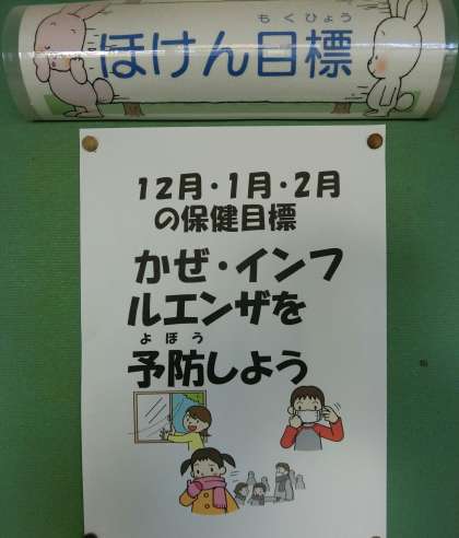 12月2日(金)、保健委員が、朝の会の時間に各学級へ「今月の保健目標」を伝えました。12月の保健目標は、『かぜ・インフルエンザを予防しよう』です。かぜやインフルエンザにかからないようにするためには、次の4つのことをこころがけましょう。