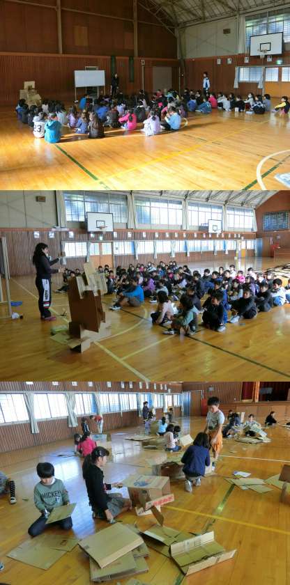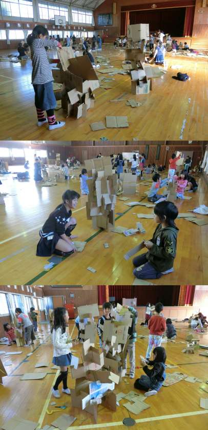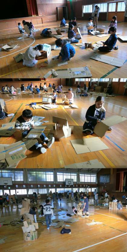 3年生 図画工作 「クミクミックス」 公開日 2016/12/03 更新日 2016/12/05 3年生 12月2日(金)、3年生の図画工作授業のようすです。今日は2学級合同で、『クミクミックス』の制作に体育館で取り組みました。段ボールを組み合わせて、自分たちの体より大きいオブジェを作りました。2人組になって、段ボールに切り込みを入れながら組み合わせ、思い思いの作品が出来上がりました。