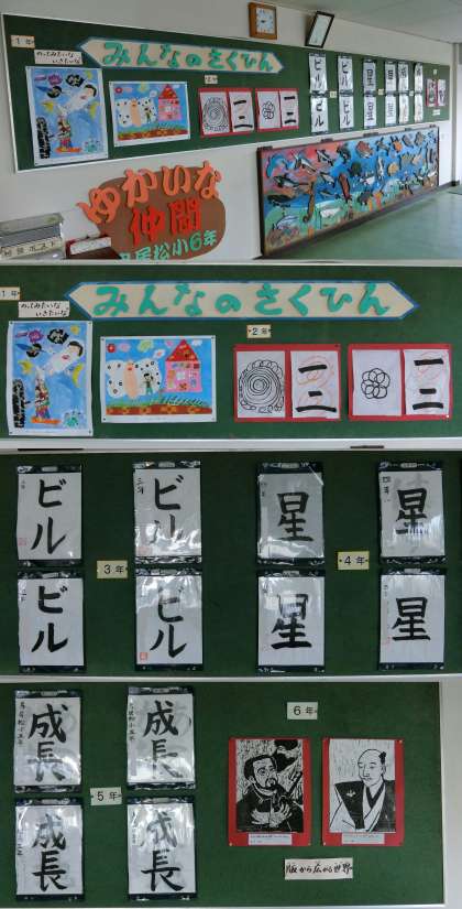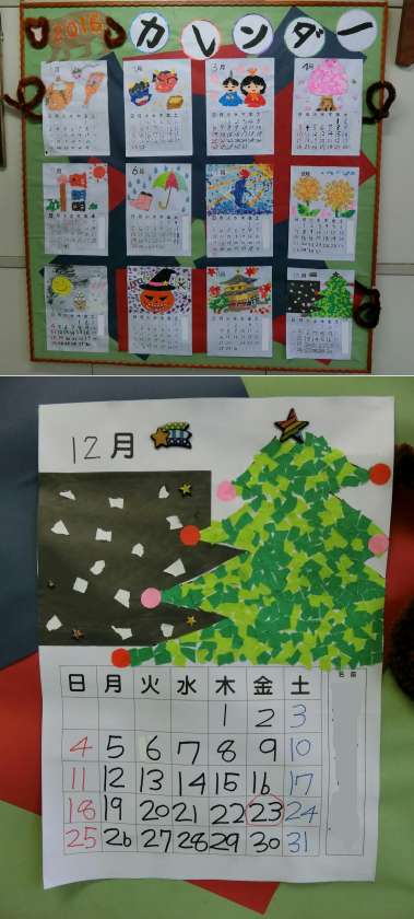 校内掲示のようすです。北館昇降口には、全学年の図画工作や習字の作品が掲示されています。校長室前には、かえで・もみじ・いちょう学級制作のカレンダーが掲示されています。申年の2016年も、あと1か月になりました。