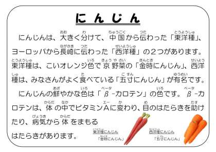 にんじんは、緑黄色野菜です。にんじんには、ビタミンAが含まれていて、目のはたらきを助けたり、はだの調子をよくするなど、体の調子を整えてくれます。にんじんは1年中ありますが、秋から冬にかけてが旬で、甘みが増しておいしくなります。