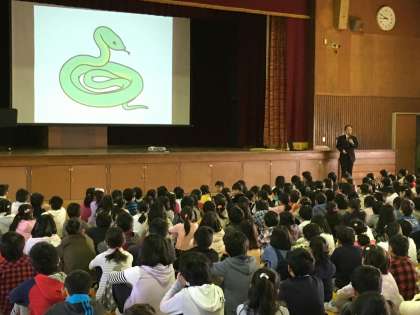 12月5日から10日までは、「人権週間」です。今日は、「人権」の話をします。「人権」とは、「人がみんな幸せに生きる権利」、そして「自分も他の人も大切にし合うこと」です。友だちを無視したり、悪口を言ったり、いじたりすることは、ぜったいにしてはいけないことです。人の脳は、「イヌの脳」「ネコの脳」「ヘビの脳」の大きく3つの役割からできているといわれます。「イヌの脳」は仲間を大切にする能力、「ネコの脳」は考える能力、「ヘビの脳」は生きる能力です。生きる能力とは、呼吸をしたり血を全身に送ったりする能力です。いじめ続けられると、生きるために必要な「ヘビの脳」がこわされていくと言われます。