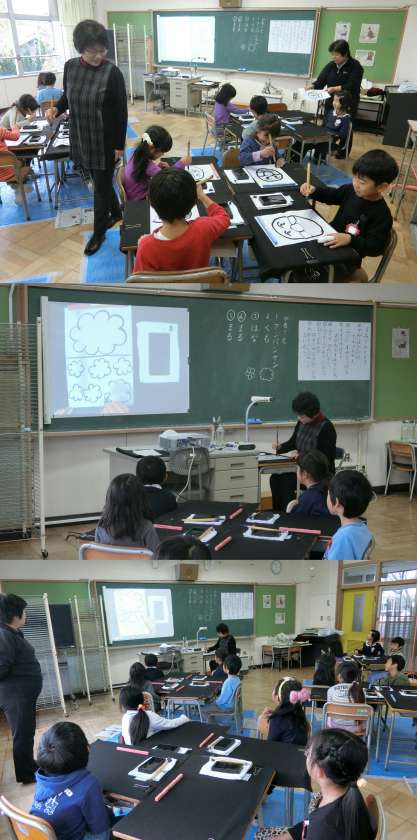 12月6日(火)、1年生の書道科授業のようすです。昨日の書道科授業から、実際に墨を使って書いています。今日は、毛筆筆の動きに慣れるために、「アンパンマン」「くも」「はな」「まる」を書きました。