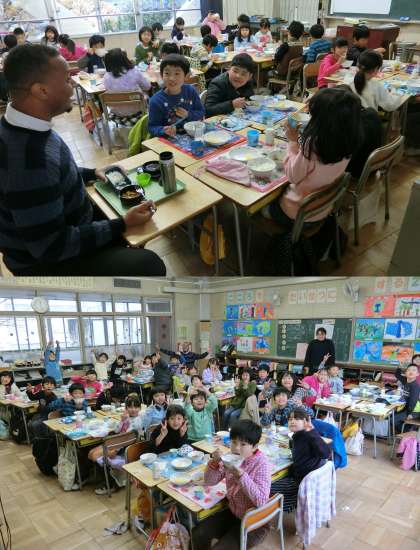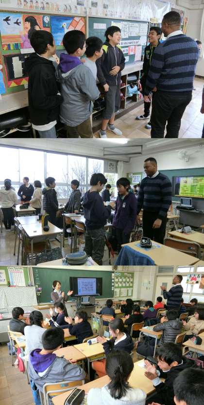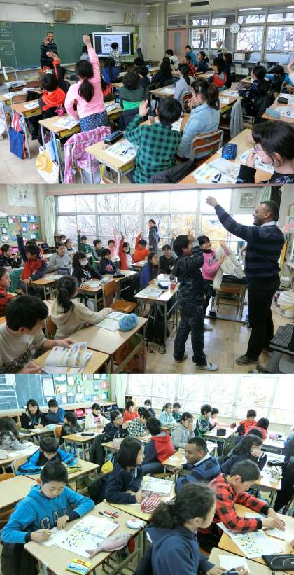 12月13日 クレイグ先生といっしょに 公開日 2016/12/13 更新日 2016/12/13 5年生 12月13日(火)、5・6年生の外国語活動のようすです。5年生は、代表の児童の背中にはられた絵について、色や形・種類などヒントを英語で伝えていました。6年生は、”What time do you(go to bed)?”と、眠る時間や起きる時間を聞き合っていました。 ALTのクレイグ先生の2学期の授業は、今日が最後でした。クレイグ先生、3学期もよろしくお願いします。