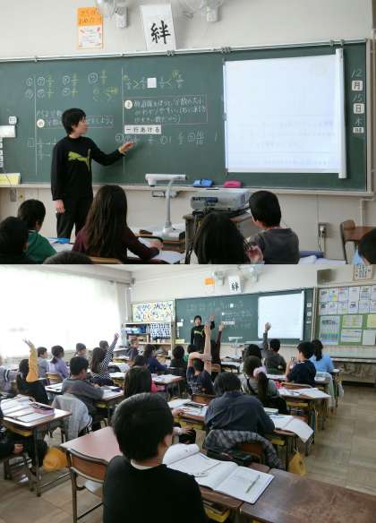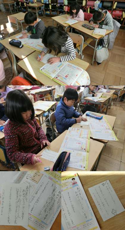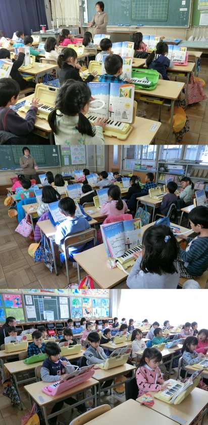 12月15日 今日の授業から 1・2・3年生 公開日 2016/12/15 更新日 2016/12/15 3年生 12月15日(木)、1年生の音楽、2年生の書写、3年生の算数授業のようすです。1年生は、鍵盤ハーモニカで「きらきらぼし」を演奏していました。2年生は、年賀状書きに取り組んでいました。3年生は、『分数』の単元で、等号(=)と不等号(><)を使って分数の大小を表す学習に取り組んでいました。