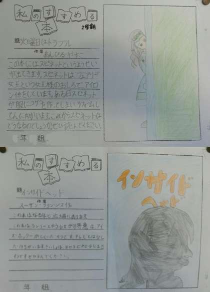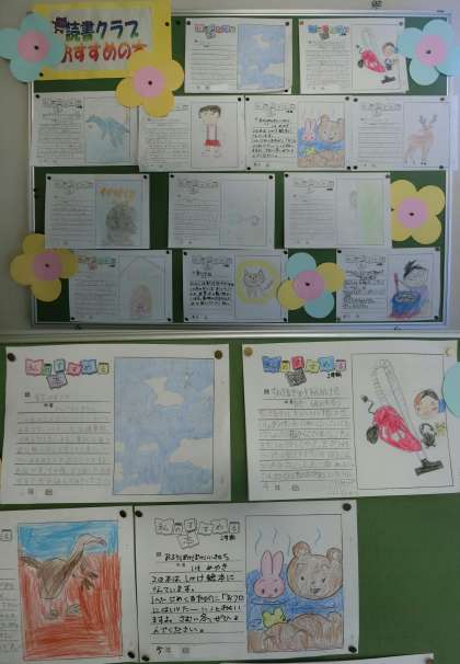 図書館入り口の掲示板のようすです。いろいろな本を読んでいる読書クラブからのおすすめの本です。