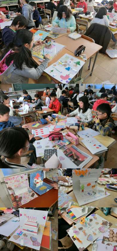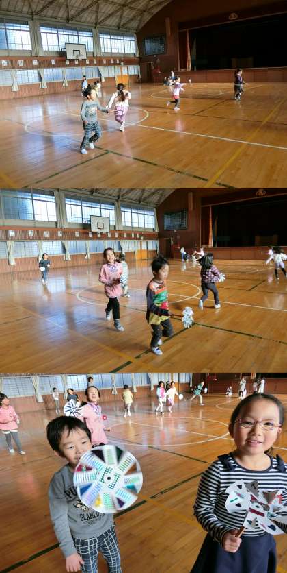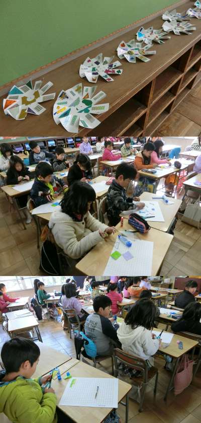12月19日 今日の授業から 1・2・4年生 公開日 2016/12/19 更新日 2016/12/19 1年生 12月19日(月)、2年生の算数、1・4年生の図画工作授業のようすです。2年生は、『三角形と四角形』の単元で、長方形・正方形・直角三角形の色紙をしきつめて、模様づくりに取り組んでいました。1年生は、『クルクルまわして』の単元で作った風車を体育館で回しました。4年生は、『幸せを運ぶカード』の単元で、動いたり飛び出したりするカードが出来上がってきました。
