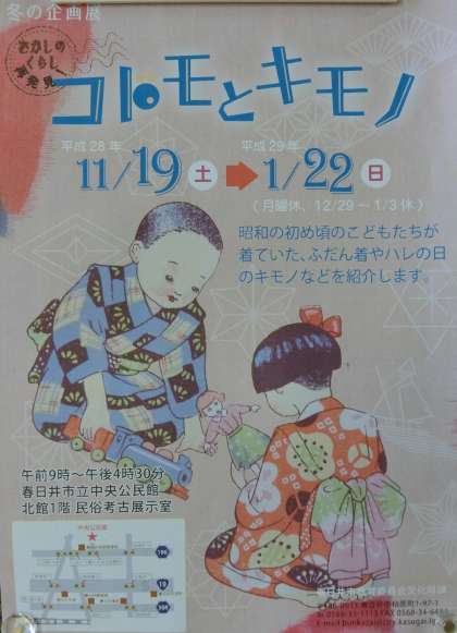 柏原町にある春日井市立中央公民館で、冬の企画展『 コドモとキモノ 』が開かれています。春日井市内で昭和のはじめころの子どもたちが着ていた、ふだん着やハレの日の着物が紹介されています。この冬休みを利用して、見学をしてみてはいかがでしょうか。