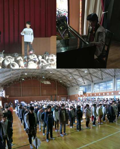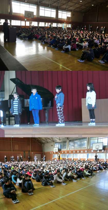 1月6日(金)、3学期の始業式を行いました。はじめに、校長先生の話を聞きました。そして、2年生の代表の人から、2学期にがんばったことと3学期の目標を発表する『誓いのことば』をしてもらいました。給食を残さず食べる、九九を全部おぼえる、漢字のとめ・はね・はらいに気をつけることなどが発表されました。6年生男子の式と6年生女子のピアノ伴奏で校歌を歌って式を終わりました。最後までしっかりと話を聞くことができ、新しい年を迎えて気持ちを引き締めて式に臨んでいるようすがよく伝わってきました。