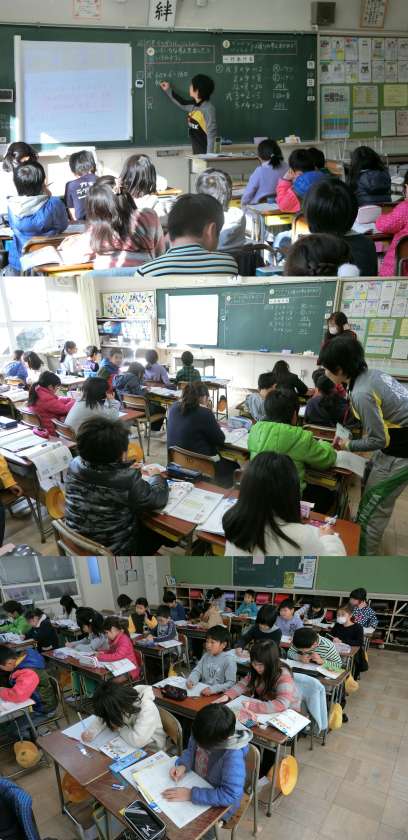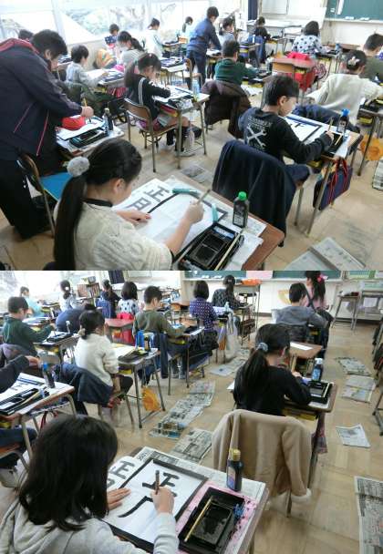 1月10日 今日の授業から 3・6年生 公開日 2017/01/10 更新日 2017/01/10 3年生 1月10日(火)、3年生の算数と書道、6年生の体育授業のようすです。3年生の算数は、『べつべつに、いっしょに』の単元で、2通りの方法で答えを見つける学習に取り組んでいました。書道は、『正月』に取り組んでいました。バスケットボールに取り組んでいる6年生は、グループに分かれてシュート練習をしていました。