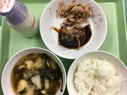 1月11日(水)、今日の給食献立は、「ごはん・牛乳・雑煮・さばのみそ煮・『れんこんの梅こんぶあえ』」でした。