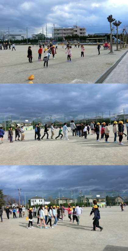 1月12日(木)、給食後の放課のようすです。今日の名古屋地方気象台の最高気温は7.7度で、寒い一日でしたが、たくさんの子どもたちが元気よく遊んでいました。2月に行われる大縄大会に向けて、たくさんのクラスが練習をしていました。