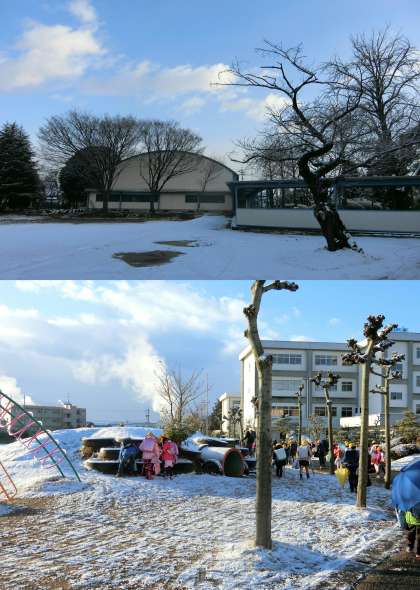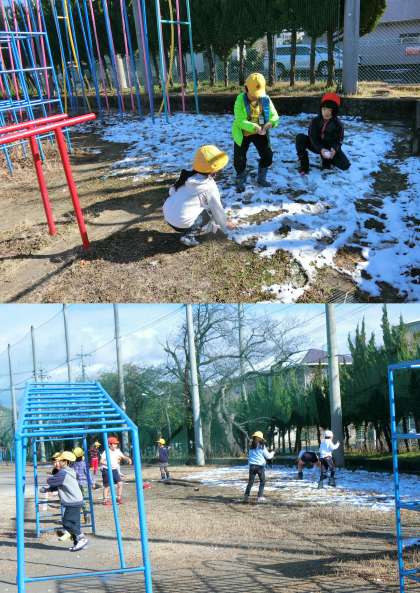 1月16日(月)、明け方から降った雪で、校内がうっすらと雪化粧をしていました。昼放課には雪もほとんど溶けていましたが、わずかに残った雪で楽しそうに遊んでいました。