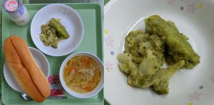 1月17日(火)、今日の給食献立は、「サンドイッチロールパン・牛乳・野菜スープ・『シェフのサーモンロールキャベツのコーンクリームソース』・ヨーグルト・大豆チョコクリーム」でした。今日の献立は、市内のホテルのシェフによるものです。