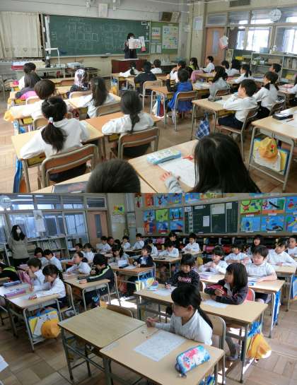 1月19日(木)、1年生の発育測定のようすです。発育測定を終えてから、クイズに答えながら、保健の先生といっしょに「かぜのよぼう」について考えました。
