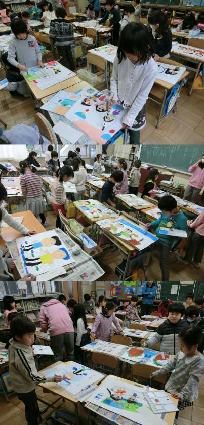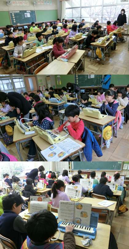 1月20日(金)、1年生の図画工作、2年生の音楽授業のようすです。1年生は、冬休みの思い出を、クレパスで下書きを描いて水彩絵の具で着色していました。2年生は、鍵盤ハーモニカのチャレンジカードに取り組んでいました。