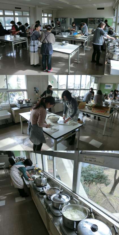 明日27日に、第9回ふれあい教育セミナー『防災のつどい、非常食・炊き出し体験』を行います。今日は、PTA役員と理事の方たちで、防災のつどいで提供する豚汁の下ごしらえをしました。