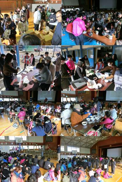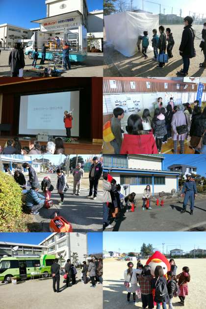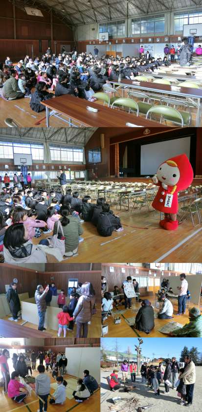 1月28日(土)、校区ふれあいフェスティバルとして、『防災のつどい、非常食・炊き出し体験』を開催しました。防災について学ぶコーナー、地震体験や煙道体験などの体験コーナー、非常食の試食と豚汁づくりなど、防災について学びました。柏原中学校のバレー部のみなさんの引率で、たくさんの体験をしました。消防署に協力いただき、簡易担架づくり、水消火器による消火訓練、煙道体験を行いました。おやじの会は、避難所の簡易間仕切りと発電機の実演をしました。春日丘高校のボランティア部のみなさんに、簡易トイレづくりの指導と運営の補助をしてもらいましした。中部大学の先生からは、防災に役立つドローンについて話を聞きました。大垣共立銀行の方には、災害時に活躍するATM機を積んだレスキュー号を紹介していただきました。