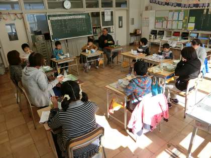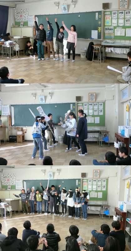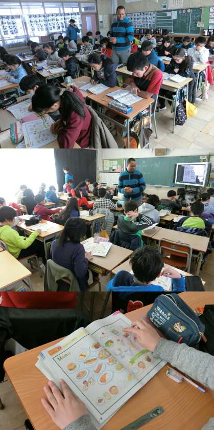 1月31日(火)、5年生と6年生の外国語活動のようすです。5年生は、英語で「どんな食べものが好きですか?」とたずねて答える活動に取り組んでいました。6年生は、桃太郎の話を英語劇で発表しました。今日は、かえで・もみじ・いちょう学級がクレイグ先生といっしょに給食を食べました。