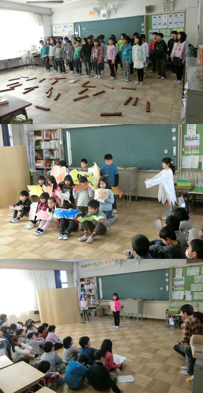 2月6日(月)、学習発表会に向けた、2年生と3年生の練習のようすです。2年生は、十二支の劇の練習をしていました。3年生は、全体練習に取り組んでいました。