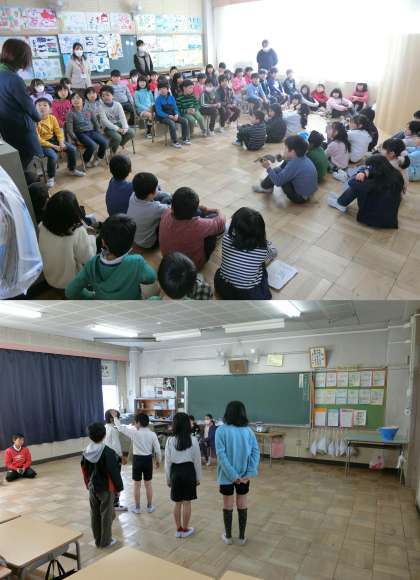 2月7日(火)、学習発表会に向けた、2年生と5年生の練習のようすです。2年生は、となりのクラスの発表を見学していました。5年生は、グループで発表の練習をしていました。